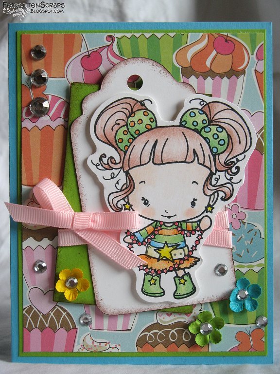 The challenge is to create a card or project based on the inspirational photo provided. I chose to use the cupcake as the inspiration and selected a fun designer paper from my scrap stash. I didn’t use the red, white & blue colors from the photo but the card still has a bright festive color scheme. The other challenge is a recipe challenge to use one designer paper, one ribbon and one stamp.