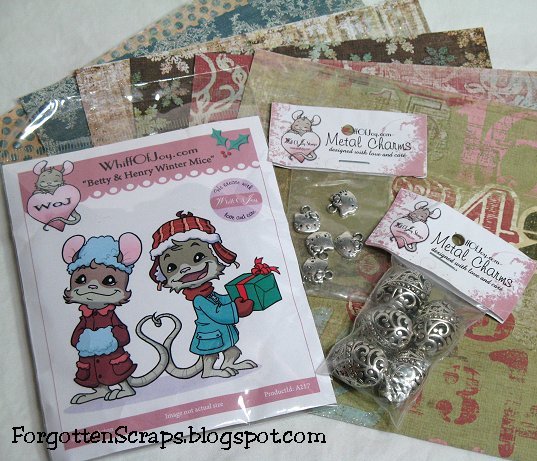 Now that I’ve got the song stuck in your head…. who wants blog candy!?!? Thanks to Katharina from Whiff of Joy, she sent over this adorable Betty & Henry Christmas Mouse stamp along with some wonderful embellishments, including metal beads and Hello Kitty charms! If that wasn’t enough, I’ve added a small sampling of Signature Christmas paper from My Minds Eye.