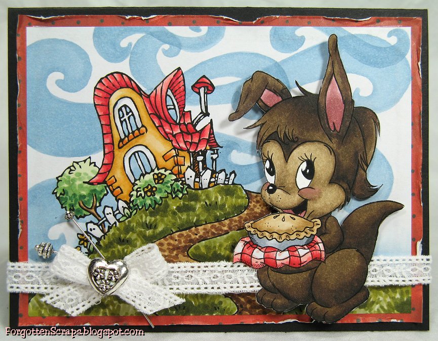 I made this card using Susie with Pie from The Stamping Bazaar drawn by Marina Neira and placed her against the Wacky House from Make it Crafty. Both images had a country feel and I thought it would be a fun match.