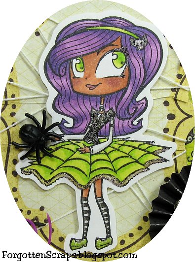 I made this card using Rio from Simply Betty Stamps for the 10th Day of Halloween Challenge! The challenge is to create a card or project using spiders and with a skirt like that, Rio and spiders naturally go together. 😀