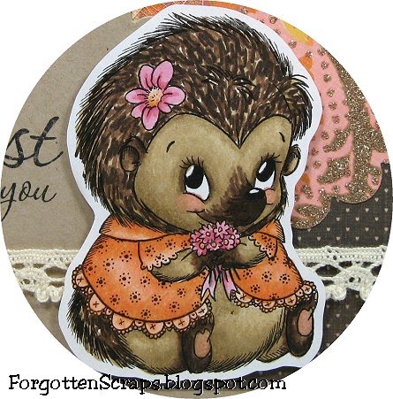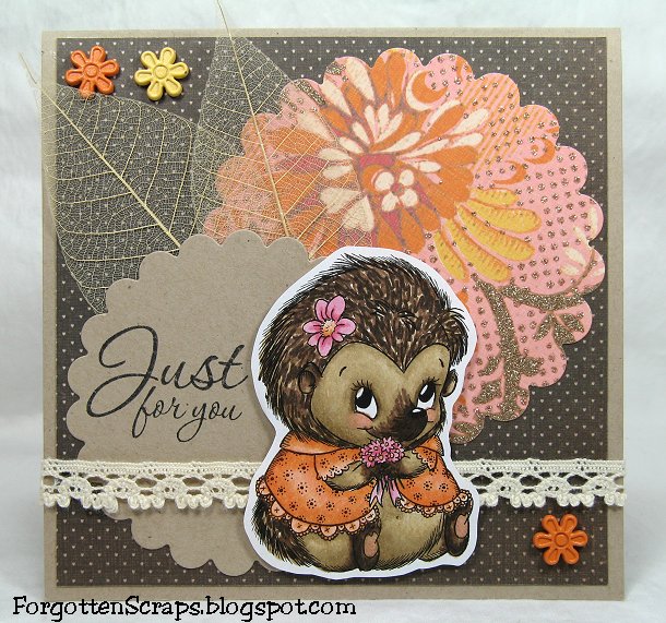 I made this card using Nancy with Bouquet from The Stamping Bazaar created by Marina Neira. As an educational experimented, I looked up hedgehogs with my daughter and then we tried to color one as realistic as possible. I never knew how multi-colored the quills and how hard it would be but it was fun!