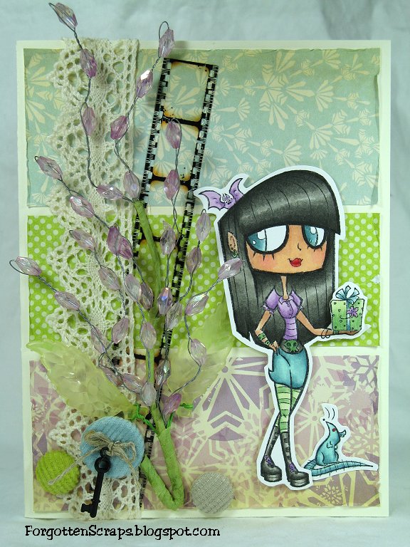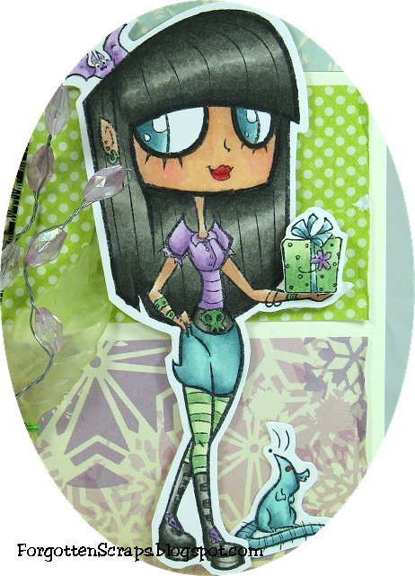 I made this card using Lola for the 7th Day of Christmas Challenge at Simply Betty Stamps. The challenge is to create a card or project using one of their Emo stamps and this is my newest arrival. We were also challenged to use the colors lime green, turquoise and purple – it wasn’t easy to pick the right papers but I finally found a combination that I liked. The colors are soft so click on the pictures for a larger view of the subtle details.