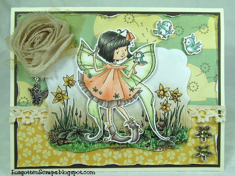 I made this card using a Fairy from Pergamano and in the background is Daffodil Dell from Make it Crafty. This is one I’ve had made for a while and finally had an empty slot today to use it. 😀 These little fairies are so cute so the card was fun to make. -Enjoy!