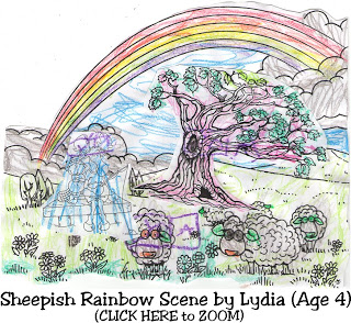 Here’s the complete view of the background, Sheepish Rainbow, before most of it was covered. I had originally wanted the rainbow without the sheep, but in the end it turned out perfect. Growing up, I helped my parents raise sheep and bottle feed the lambs in our backyard until they were old enough to send out in the pasture. It was fun and those little lambs were so cute.