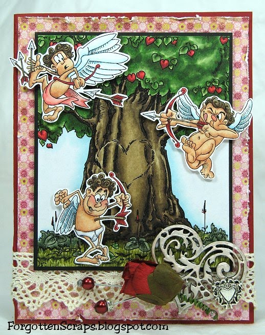 I made this card a while ago and have been waiting for February to show it off! All the images are from Make it Crafty including the Tree of Love in the background. These fun cupids also decorate my blog… see if you can spot all three!