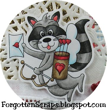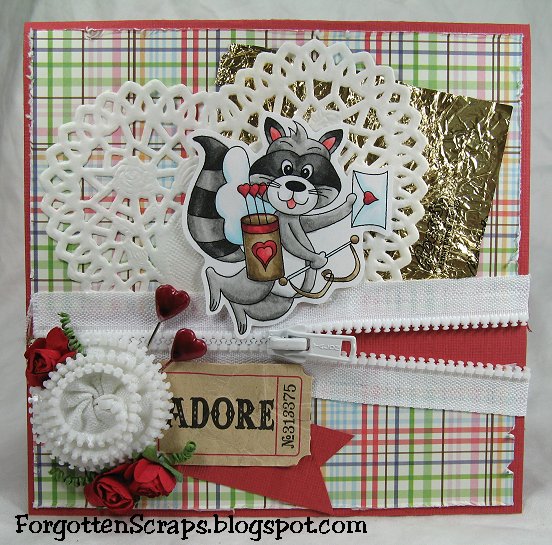 The challenge theme is “Recycled Romance: use something in your creation that would normally be thrown away and not designed for crafting plus combine it with a Valentines theme.” On my card I used a broken zipper, a used cake-plate doily (shhh… I had to grab a fresh clean one to use! he he), and finally a gold foil candy wrapper (which really was from the trash can, go figure!).