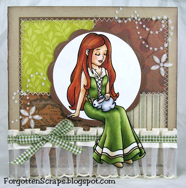 I made this card using my new stamp Spring Whisper and is part of a Seasonal Sisters series. Even though she represents Spring, I wanted to make a card with more of an St. Patrick’s Day feel and used deep greens and browns, and red hair of course. You can see the stitching so this is a card I enjoyed making at my Mom’s house. ;D