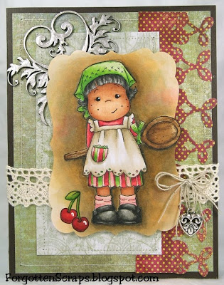 Here she is, “Cooking Tilda with Wooden Spoon”… well at least I think that is her name. I finally got around to putting this one on a card and kept the embellishments in the background so she’ll stand out more. As you can see I also had to add a face. 😀 This little smirk appears to work out well and this time I also added lashes.