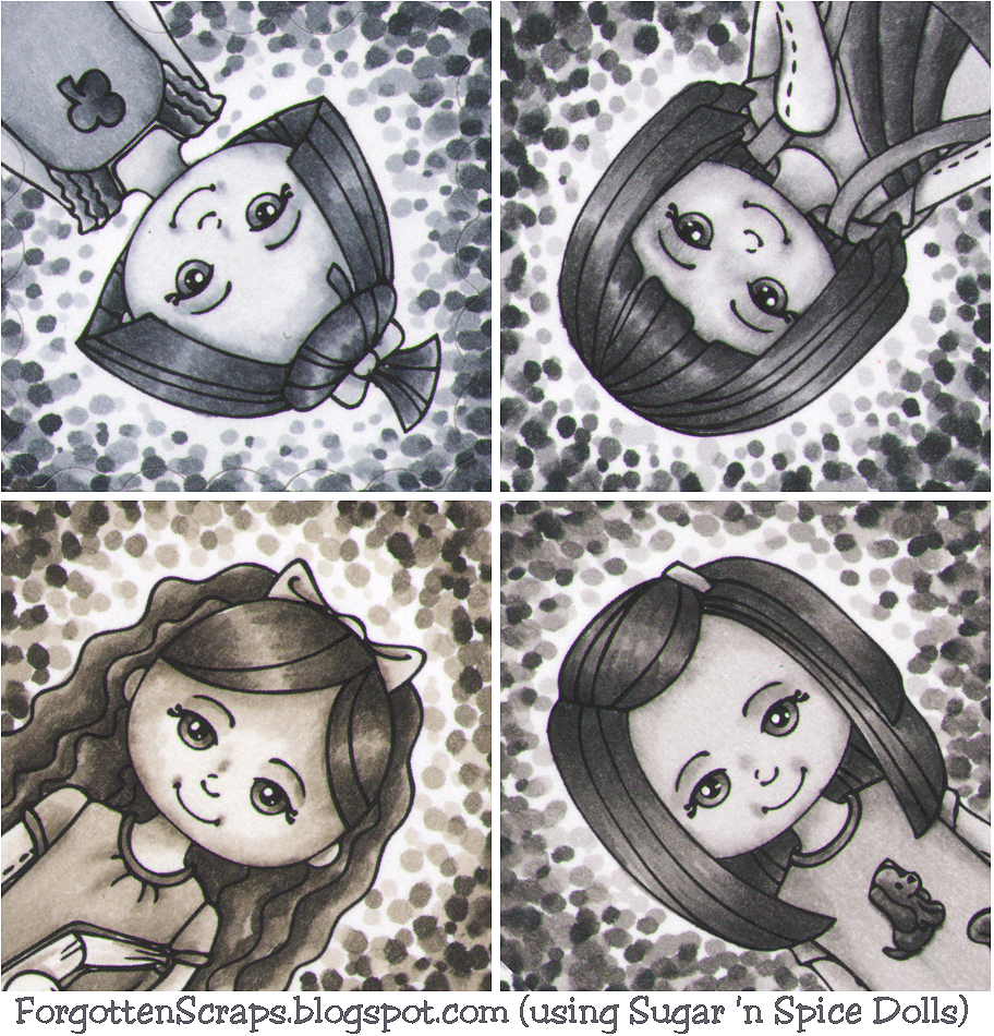 Ever wonder what the difference is between all the Copic gray colors? My friend Ruby had the same question and I decided it would be fun to have a side-by-side comparison! So here it is using four of the new Suger ‘n Spice Dolls from Little Miss Muffet Stamps.