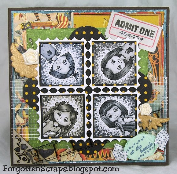 I used the carnival themed paper again and added various objects such as ribbon roses, linen mesh, chipboard embellishments, hat pins, film strip, ticket and carnival candy (faux of course)! Did you spot all that? Now we just need to find Waldo and we’ll be set.