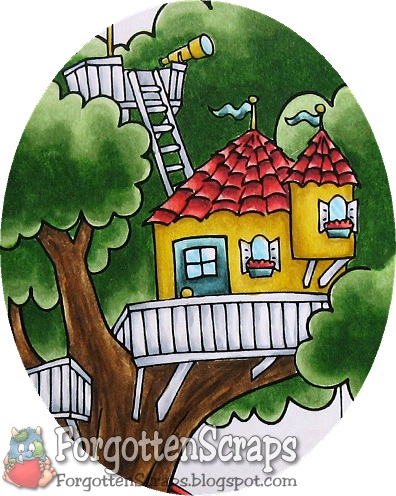 Here’s my second preview today of new releases from Little Miss Muffet Stamps… this one is one of my favorites! I mean, what girl wouldn’t want to have a fancy treehouse in the backyard with all the works! It even has a slide which was a last minute addition. ;D