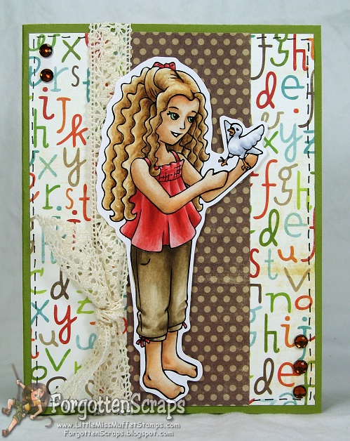 I made this a simple card to give focus to the image – mainly because I printed out the image larger than normal – just some gems, lace and faux stitching and Voilà! A card. ;D Hope you like it and stay tuned for a few more projects today.