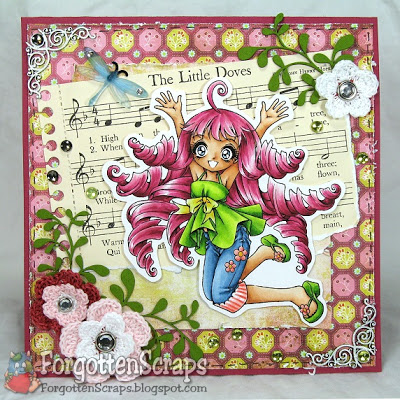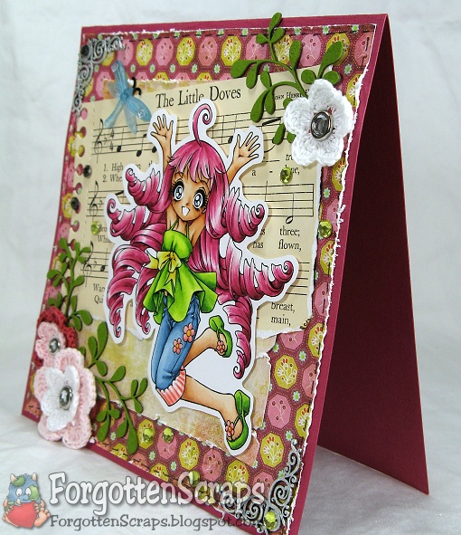 For my card I used Zoe Celebrates from Make it Crafty plus Round Leaves and Love Heart Swirls chippies. I wanted to use a new combination so for the hair I combined RV11, RV34, RV17, RV19 and RV69. I liked how it turned out but then couldn’t help using a favorite pink combination on the clothes too… so I slipped in some R20, R21 and R22 on the pants and shoes.