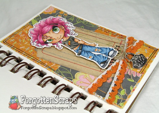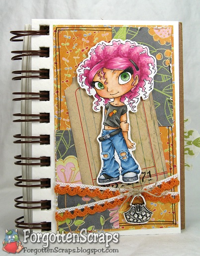 I made this mini journal page for the Simply Betty Stamps Gettin’ Sketchy challenge and chose to use the same sketch that SBS is sponsoring this week… Deconstructing Jen, Sketch #17. The layout is a simplified version of the sketch so it would fit on the smaller page and I used a Tim Holtz tag for the center. Then finished it up with some leftover orange lace I had from last year and tied on a charm.