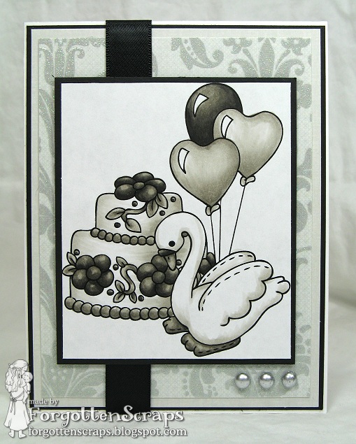 It’s new release week at Little Miss Muffet Stamps and I have four new images we’re showing off today and tomorrow. Here I’m featuring Harvest Swan and I colored it up in black and whites for a wedding card. I kept the card simple and added a silk black ribbon and only a few dew drops at the lower corner.