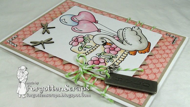 I had colored the image first so it was difficult to find the right shade of pink decorative paper, however, if I hadn’t pointed that out then it would have been a good fake. Oops! I used some baker’s twine to attach a couple charms and then added some chippie dragonflies from Make it Crafty and gems in the corner.