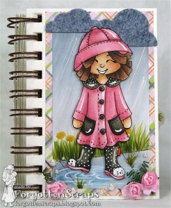 It’s another challenge day at Little Miss Muffet Stamps and this round our theme is “Girlie Girl!” That’s an easy one for most of us so we want to see lots of pink, flowers, pearls and/or ribbon. ;D For my project I used Paprika and gave her a pink raincoat and rain hat. ;D