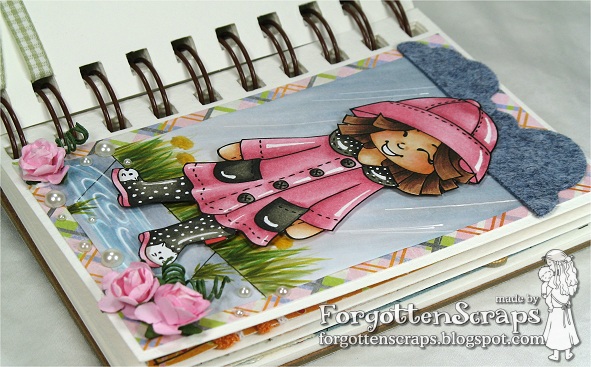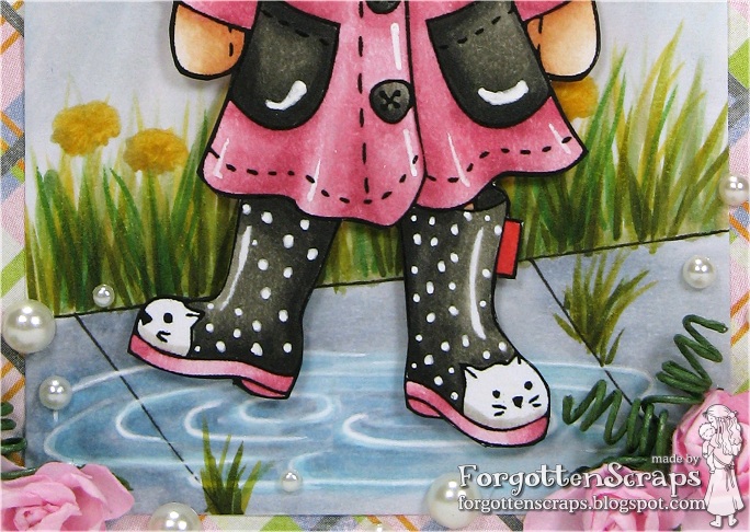 It’s another challenge day at Little Miss Muffet Stamps and this round our theme is “Girlie Girl!” That’s an easy one for most of us so we want to see lots of pink, flowers, pearls and/or ribbon. ;D For my project I used Paprika and gave her a pink raincoat and rain hat. ;D