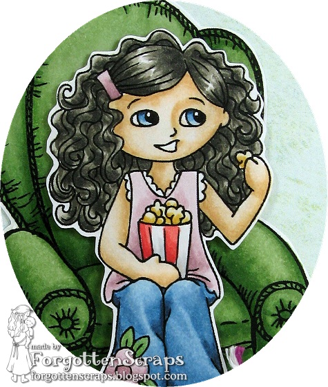 For my project I used Agent Popcorn from Little Miss Muffet Stamps and Comfy Chair from Make it Crafty. The pairing makes for a good movie night. ;D