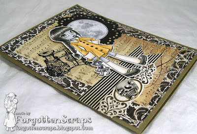 I made this card to send to Betty and wanted a cheerful yet creepy feel so I used lots of black with a touch of sunny yellow. The image I used is Lola Addams from Simply Betty Stamps, of course, and the moon was a Martha Stewart label that I colored in with N0, N2, N3 and N4.