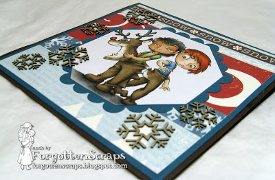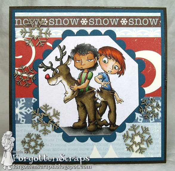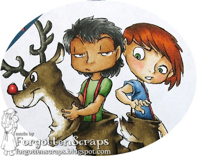 The image I used is Reindeer Boys and as you *might* have noticed already … they aren’t zombies!! He he he. All the areas that were zombie related were wiped away then I used a fine tipped Copic black liner pen and drew normal lines back in where it was needed.