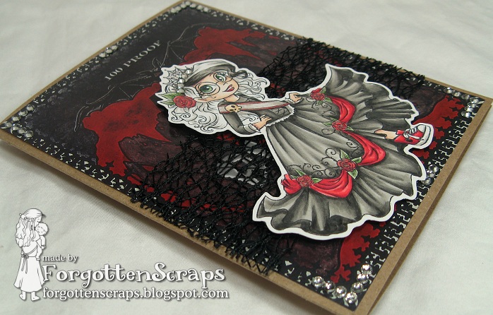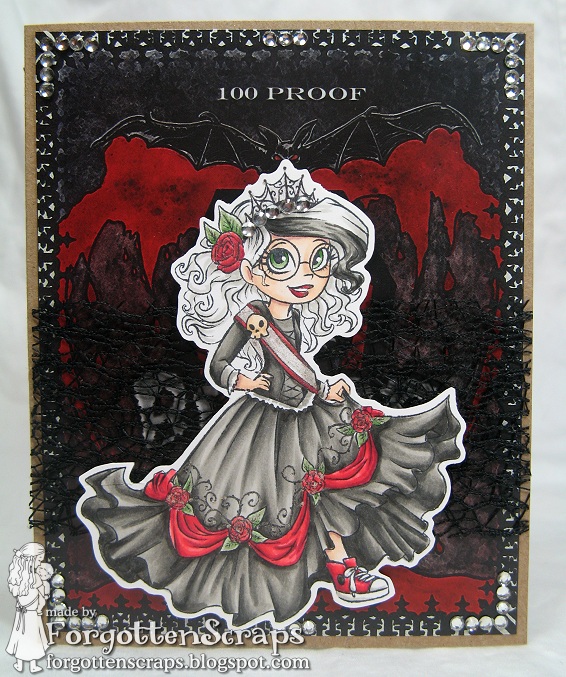 The image I used is Prom Queen Rio which is from the Back 2 School Teen Scene from Simply B Stamps. The background is actually a Halloween sticker and is what I got my inspiration from. So the card was really simple to put together… just peel and stick on kraft paper and then added some rhinestones and mesh ribbon.