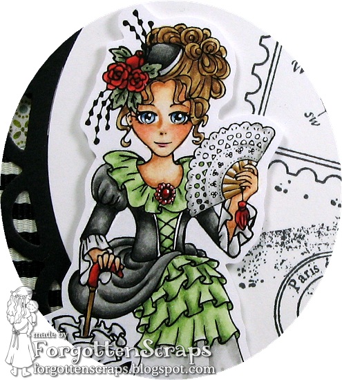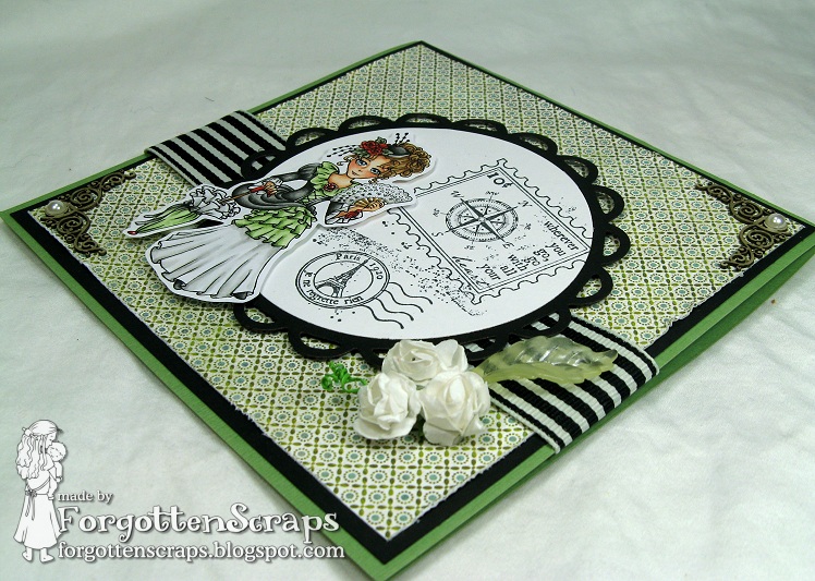 I colored his French girl for the rubber stamp packaging which was done a while ago so putting together the card went by fast. It’s nice when that happens sometimes! Nothing extra special about the card layout except I was able to use a new Netabilities die I got last week and I was even good to use a few old flowers I’ve had laying around. So that would be something new, something old… now I’d just need something borrowed! LOL