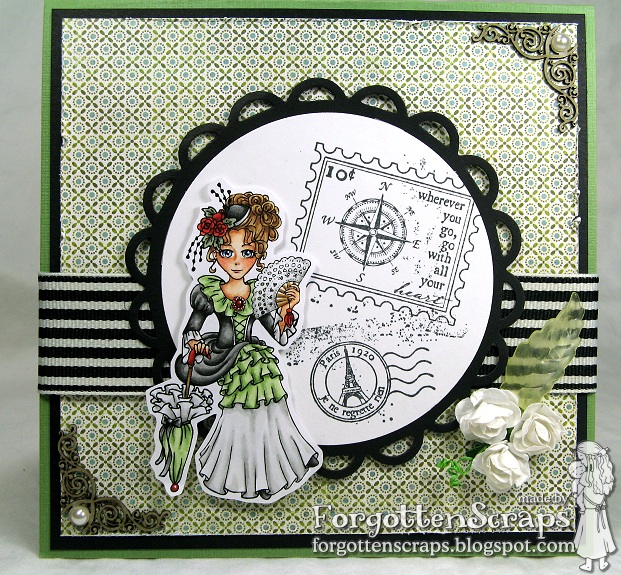 For my project I used elements from all three companies… La Jeune Fille à l’Eventail from Little Miss Muffet Stamps (which means “The Girl with a Fan” in case you were wondering), Vintage Travel Postage Stamps from Whimsy, and Love Heart Swirls chipboard accessents from Make it Crafty.