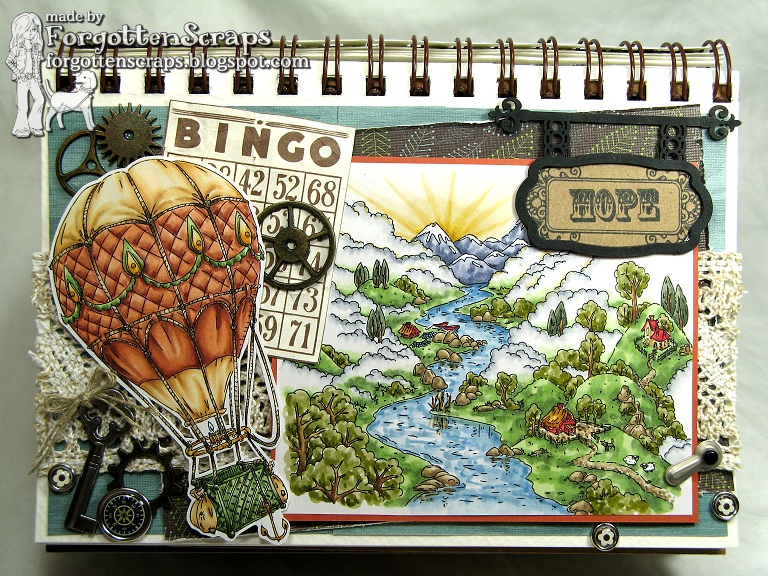 I used a little green in the Hot Air Balloon but the rest was colored with contrasting rusts and tans to help set it off. The balloon was fun to color and I even got to add a few pleats. 😀 Hope you’ve enjoyed this journal page and thanks for stopping by!