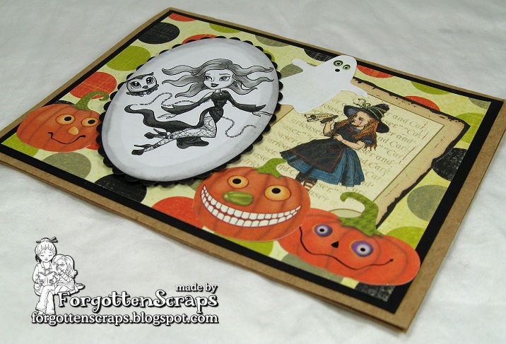 The image I’m starting off with is Haunting Hannah and Hoot. I made cards out of each of them using the same elements and layout then combined them for a gift set. Basically everything I used are left over scraps from Halloween two years ago and it felt good to use it up. This ensemble was part of the 19 cards I made over the weekend. ;D