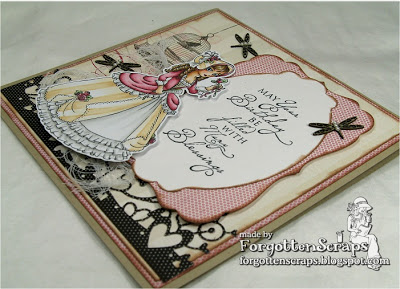 This little cute is Le Parfum des Roses by Little Miss Muffet Stamps and is one ofthe first rubber stamps I released too. 😀 I had fun coloring this gal’s dress and even took the large stripe pattern from the decorative paper and used it on the lower layers. I wasn’t sure if it would work out but now that I see it finished I think it looks ok.