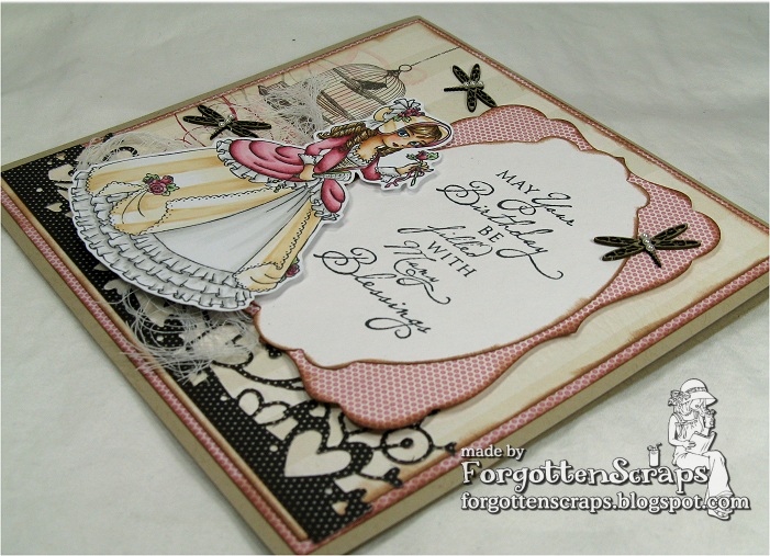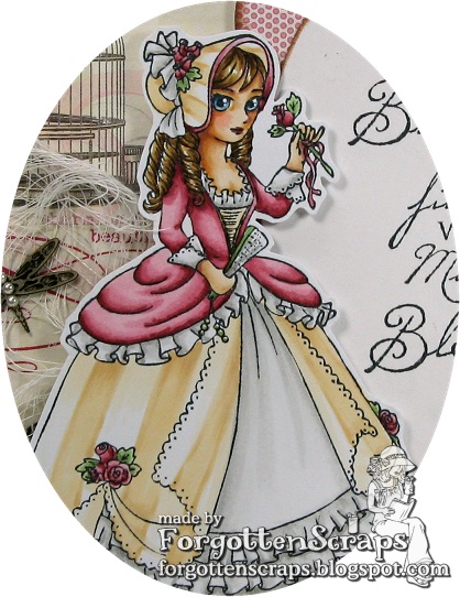If I can say, this image is my favorite from the Petites Dames theme although they are all fun to color! I had fun putting this card together and it was nice to only have to make one of something. If you can beleive it was difficult – I shifted and moved around so many peices that I’m surpised I finished. LOL