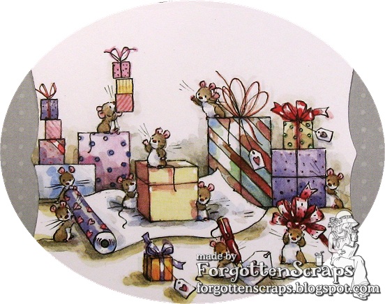 Here’s another card using a pre-colored Mice are Nice image from Lili of the Valley.  These cute mice are helping with the gift wrapping – something I wouldn’t mind help with.  😀  Maybe they’re like the little shoe elves and can help me around Christmas time.  LOL  This is fourth card I made with the diecut sheet so I have two more to share through out the month.
