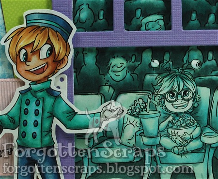 Did you guess my movie yet? He he he, ok, I have a couple clues for you but before I get to that, just a few details about my card. The images I used are Little Usher Miller and At the Movies Jude from Simply B Stamps which are combined with At the Movie Theatre from Make it Crafty (which I merged a couple times for a grander audience). The box of popcorn on the bottom right is a snipet from the At the Movie Theatre image but the little bits of popcorn I had snuck in from Agent Popcorn Aiming from Little Miss Muffet Stamps – they were perfect for scattering all over the floor for a more authentic theatre experience!