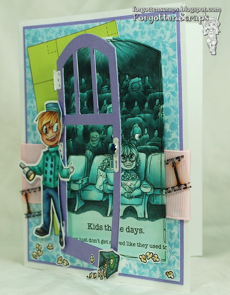 Did you guess my movie yet? He he he, ok, I have a couple clues for you but before I get to that, just a few details about my card. The images I used are Little Usher Miller and At the Movies Jude from Simply B Stamps which are combined with At the Movie Theatre from Make it Crafty (which I merged a couple times for a grander audience). The box of popcorn on the bottom right is a snipet from the At the Movie Theatre image but the little bits of popcorn I had snuck in from Agent Popcorn Aiming from Little Miss Muffet Stamps – they were perfect for scattering all over the floor for a more authentic theatre experience!