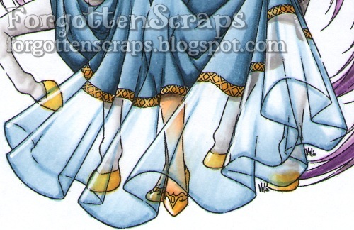 For some areas on this image, mainly the dress and shoes, I used a white gel pen to add highlights back in. I was hoping this would give the sheer fabric a little reflective shine to it and set it apart from the other fabrics in the dress. I added highlights to the unicorn’s horn and hoofs as well as the golden shoes of the princess.
