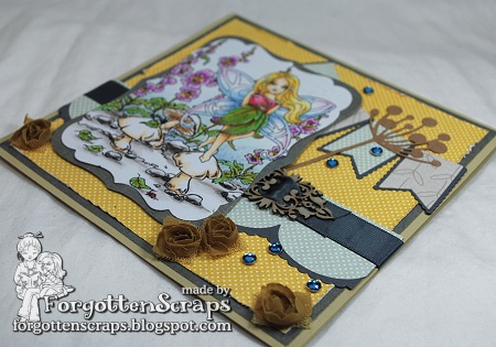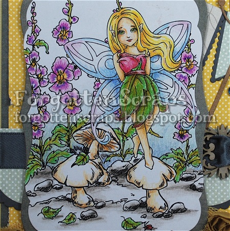 For my project I used Cadrian from Little Miss Muffet Stamps and I backed her up with the Snap Dragon Garden from Make it Crafty.  For my scallops, I used a bunch of diecuts to create the scalloped border in the background (adorned with ribbon and a chippie) and the banners in the background.  If I was thinking ahead on this one I would have done a scalloped card border but that was more of an after thought.  LOL