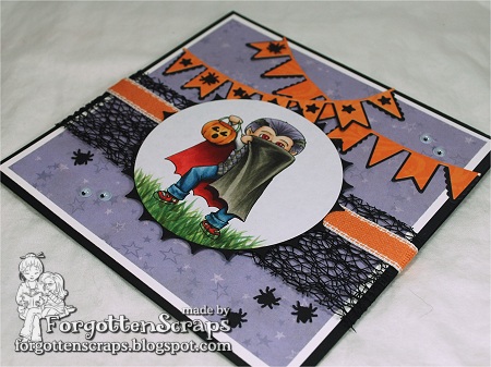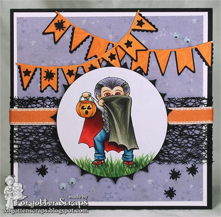 The image is Bandit Boy Tom at Halloween from Little Miss Muffet Stamps and in the background I used the new Party Banner Diecut, also from Little Miss Muffet Stamps!  I used both layers plus the stars to decorate them and I couldn’t resit using my new spider punch to add a few spooky details.