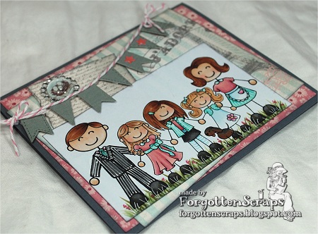 For my project I used the new “The Van Family” and created a representation of my family.  With Dad, Mom, three Sisters and complete with our little pooch.  Each of these images are separate so there are many ways you can use them.  You can get them individually or the whole set at a great introductory price!!  I’ve also used the Party Banner from Little Miss Muffet Stamps and embellished it with faux stitches and Baker’s Twine.