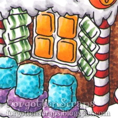Here’s a close up of the side of the house which shows the gingerbread and gumdrops in more details.  There was a lot of dotting that went into this one but the effect is perfect for what I wanted.  I also wanted to bring in all sorts of colors to make it bright and cheery like candy usually is but hopefully I’ve used enough reds and greens to keep it holiday oriented.  😀  After all, it IS a Gingerbread house!!