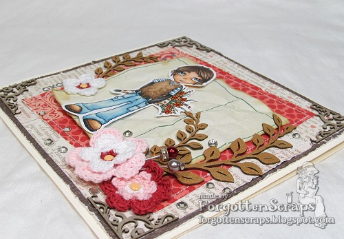 This project uses Casper Silvermist Crush from Little Miss Muffet Stamps which is an exclusive image drawn by Pollycraft! Plus I have added a variety of chippies from Make it Crafty – the Ornate Corners on the four corners and the Leaf Branches were painted with gold before adding them to the mix. Then the flowers and rub-on are from Stampin’ Up and you should be able to spot stitching on almost all my projects by now. 😀 Love that little sewing machine!