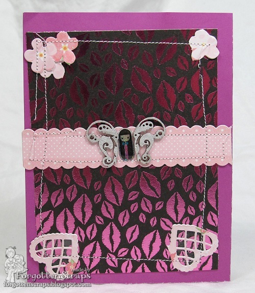 Lastly I have another project from my crafty daughter who also wanted to use the Fluttering Wings chipboard embellishments on her project. By placing the wings off to the side of the sticker, her project came together much quicker than mine. Which gave her plenty of time to convince me that she could use the sewing machine! She’s been getting better and better with the sewing after making a small quilt and a doll blanket with Grandma. 😀