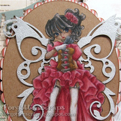 For this challenge I selected to use Elizabeth J from Make it Crafty and add the Fluttering Wings chipboard embellishments (also from Make it Crafty) to convert this gal into a butterfly faerie. To do this I colored my image first then used a hobby knife to cut around both her left and right side. I was careful to stay on the outside of the line so the black line-art would still be noticeable later on. I frequently checked with the wings to see how far I needed to cut then added an extra half-inch so I wouldn’t rip the paper. Also another helpful hint, if you are using diecuts to cut the shape around the image, make sure you do that before inserting the wings. That way the image will be flat when going through the diecutter.