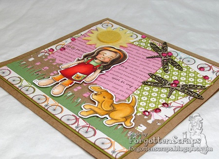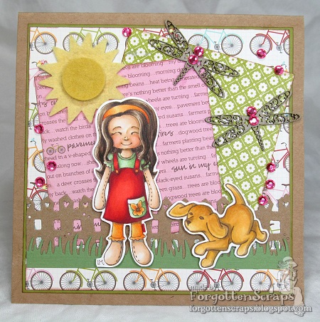 The images are rubber stamps from Little Miss Muffet Stamps and are Lavender and Puppy Additions. (I love those puppies!) They were colored with Copic markers on Neenah paper so it was able to handle most of my blending. Then shadows were added with BV23. I wanted to go with bright and cheery colors and also use some of my forgotten diecuts. Lastly chipboard from Make it Crafty was added and some gems for a touch of sparkle. 😀