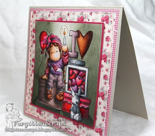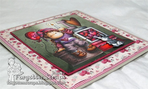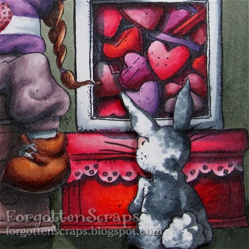I’ve used several images on this one and they’re all form Magnolia too! There were five stamps that were masked and/or cut out to create this scene, including: Tilda with Cross Stitched Heart, I Love You (I’ve left off the “You” portion), Lovely Balloons (only one of them), Tilda and Her Bunny (just the bunny was used), and finally Tilda’s Tin Boxes.