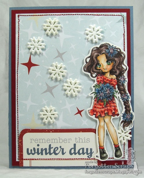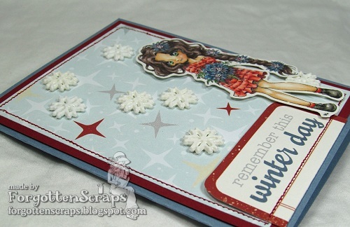 On this project I used the rubber stamp Cynthia from Make it Crafty. She is part of the 60’s Girlfriend Collection and even though she’s a spring/summer theme, I thought those flowers were be perfect for Christmas! And yes, I know they’re blue – but that was my fault as I got carried away with the red dress before realizing that poinsettias are red. Oops! I couldn’t do red anymore so went with the next color to match the papers. LOL
