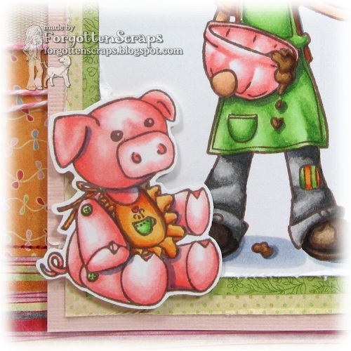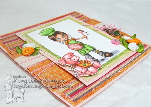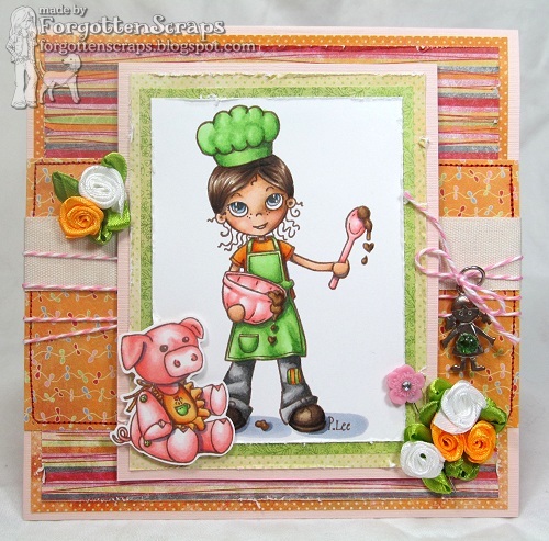For my project I used (of course) Celeste Amberglow Cookin’ Up Some Love plus the little piggy from Tea Party Friends #1 to go along with her. Both are from Little Miss Muffet Stamps, the first one was drawn by Pollycraft and the second one was drawn by me. ;D