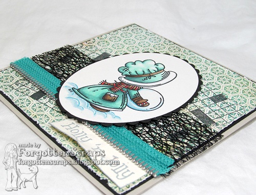 The rest of the card was simple to put together.  I had a large crossword background stamp that I used on the decorative paper then added some more black and teal accents with the ribbon.  Lastly, the sentiment was stamped in London Fog and a tag was created.