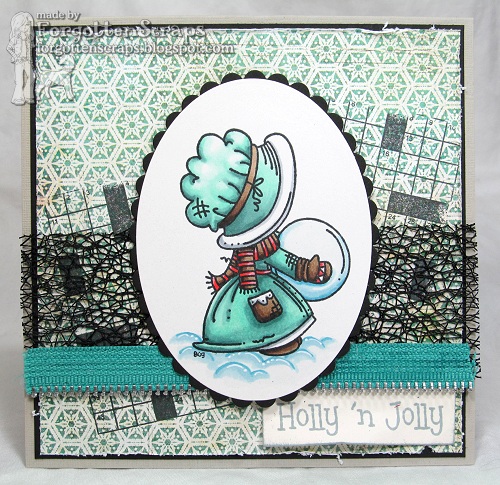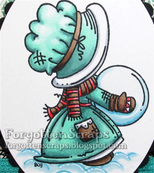 For my project I wanted to show off one of the Bugaboo rubber stamps that is available at Little Miss Muffet Stamps… this one is Fancy Sunbonnet Winter Snowball.  She even versatile enough that the snowball can easily be turned into a bauble!  You’ll have to check out Faye’s website to see that.  She has a great story to go along with it.  😀  The sentiment is one that was included in another Fancy Sunbonnet stamp and worked great for this one too.