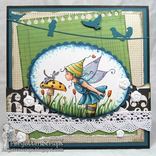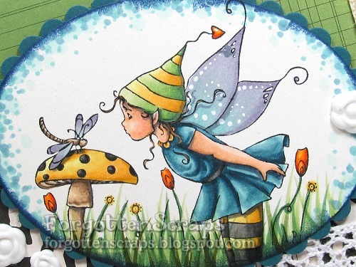 I colored the image to match the paper but also wanted to bring out some yellows. I was tempted to color the mushroom red and it took all my concentration to remember not to. LOL Don’t get me wrong, the traditional red mushroom is adorable, but also wanted to try something different. As a final touch, I added white dots on the wings with the White Gel pen.